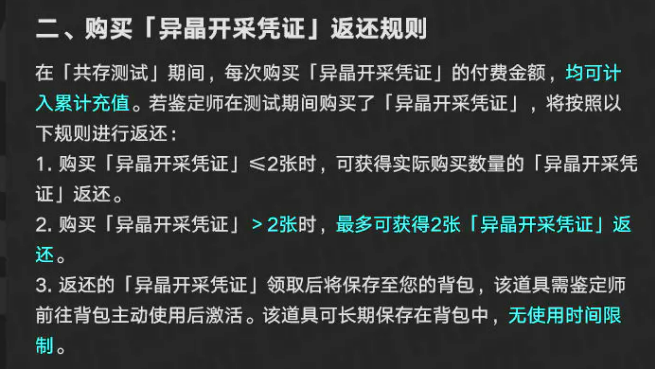 异晶开采凭证(通行证)实行双重返还机制。首先,购买凭证所支付的金额,将统一纳入上述异晶返还规则进行折算;其次,在凭证数量层面单独设置返还上限:单账号最多返还2张凭证道具。无论测试期间购买数量为1张、3张或更多,公测仅发放2张凭证道具至背包。该道具无使用时效限制,但需玩家主动打开背包并手动激活方可生效。