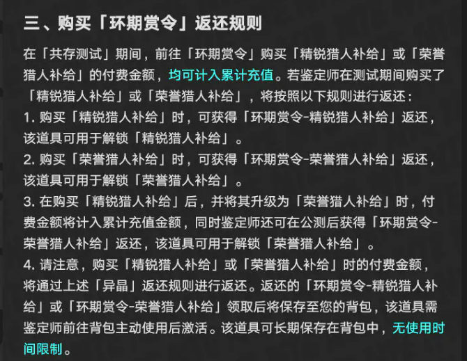 环期赏令系统包含精锐猎人补给与荣誉猎人补给两个层级。测试期间解锁任一档位,公测将1:1返还对应层级的解锁道具;若测试中完成从精锐版升级至荣誉版的操作,则公测直接返还荣誉猎人补给解锁道具,不拆分返还。与通行证一致,购买战令所支出的费用同样参与异晶返还计算,返还所得道具亦存放于背包,需手动激活使用。