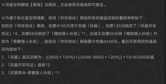 实例演算便于理解:测试期内充值4100元异晶,另花费120元购入4张异晶开采凭证,再以68元解锁精锐猎人补给、60元升级至荣誉猎人补给,总支出4348元。公测返还明细如下:3600元部分获54000异晶,余下748元获9350异晶,异晶总计63350个;凭证返还上限为2张道具;战令因完成升级,返还1个荣誉猎人补给解锁道具。