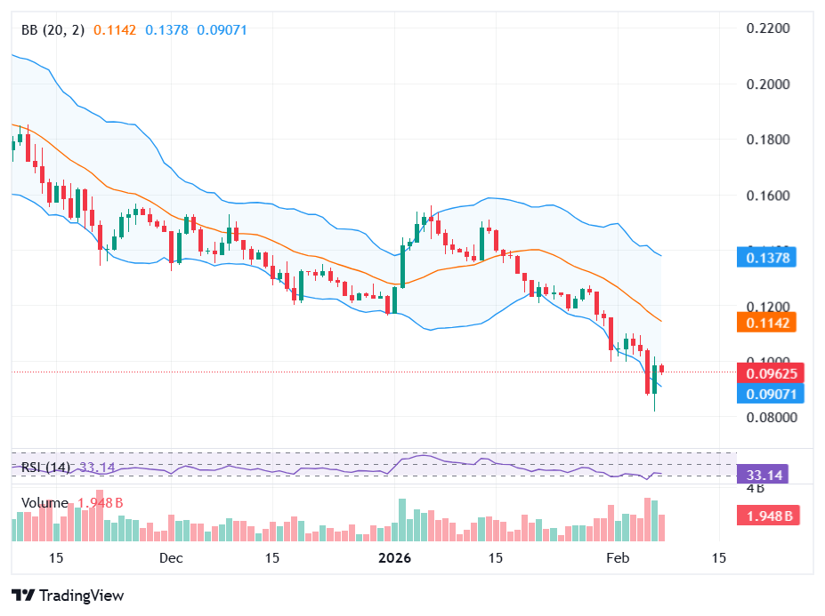 尽管价格上行,但交易量仍大幅下降51.38%,目前为19.3亿美元。该迷因币的相对强弱指数(RSI)为33.14,显示超卖状态。结合布林带指标来看,这可能支撑交易量回升。