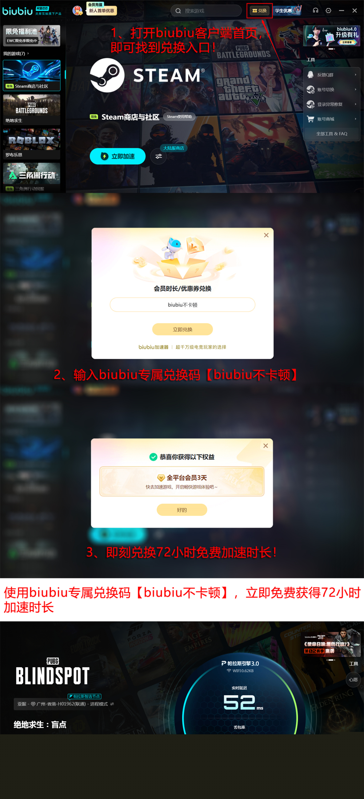 关于“《绝地求生:盲点》免费吗”这一问题,结论明确:当前阶段零费用入场,未来亦坚持公平竞技原则。玩家可通过注册获取24小时加速时长;完成首次登录后,输入兑换码【biubiu不卡顿】,即可额外获得72小时使用权,总计享96小时免费加速服务。该兑换码适用于所有账号,每位用户限用一次。