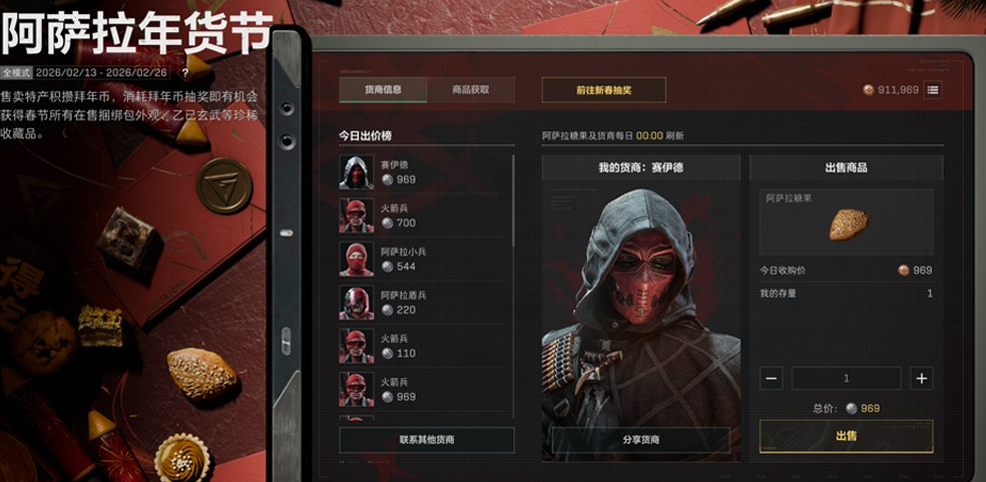 第四项活动“阿萨拉年货节”以每日任务为核心驱动。玩家每日完成指定游戏行为(如击杀、爆头、拾取等)即可获得阿萨拉糖果,该道具支持兑换为拜年币。拜年币可用于参与概率型抽奖,奖池包含传说级与史诗级武器外观,以及乙巳玄武等红色稀有收藏品。活动机制强调长期参与,但最终产出具有随机性。