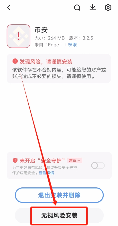 下载完成后需允许本次安装,系统可能提示安全风险,这是因为安装包并非来自官方应用商店。确认是从币安官网下载的正版应用后,选择忽略风险继续安装。