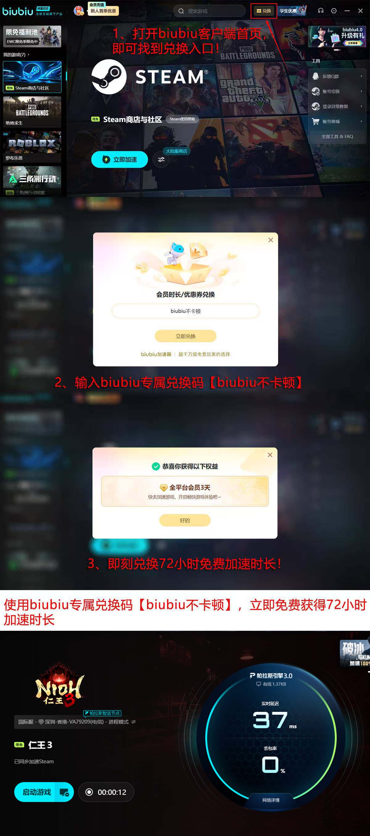 新用户注册后可即刻启用24小时免费加速服务。平台另设三日体验权益,每位用户限领一次,输入口令【biubiu不卡顿】即可激活。