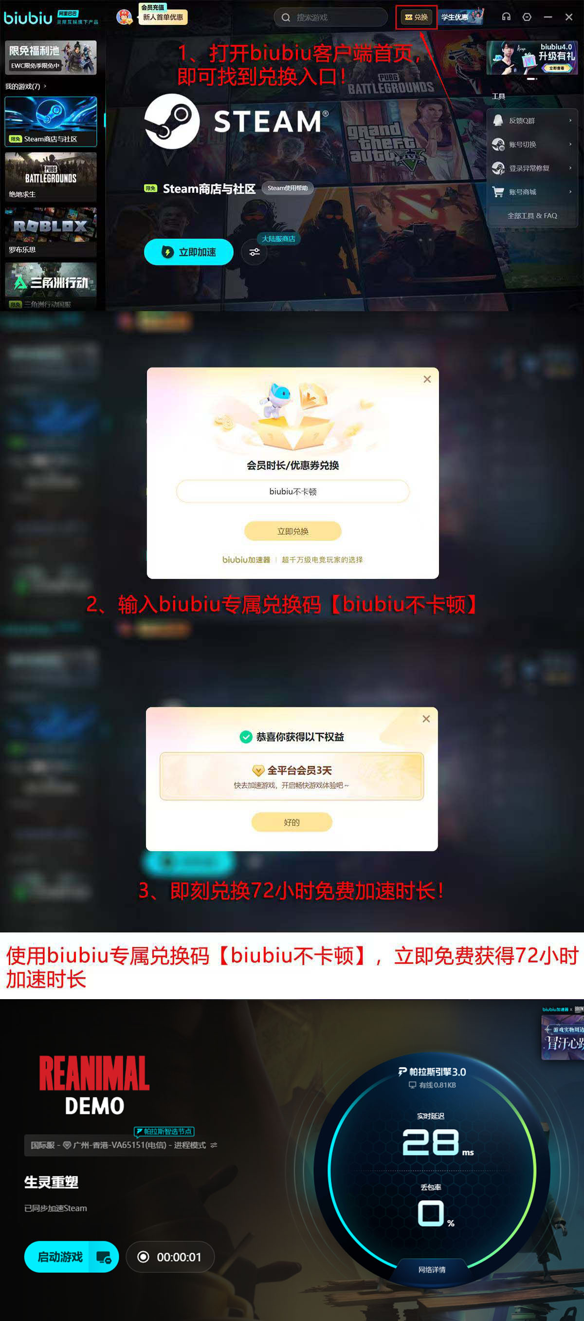 新用户现可免费获取总计96小时加速时长:完成账号注册即赠24小时新手福利;另在首页“兑换”入口输入口令【biubiu不卡顿】,可额外领取72小时使用权限。两项权益叠加生效,无需绑定特定游戏。此外,借助该工具对Steam客户端进行全局加速,亦可显著缩短《生灵重塑》国际服版本的下载等待时间。