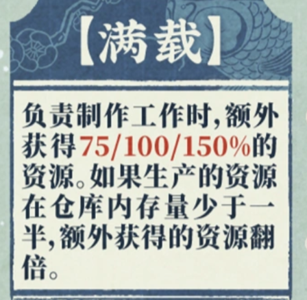 钟雪渔拥有两项专属技能:“满载”与“渔利”。其中,“满载”可在执行制作类工作时,依据技能等级额外产出75%、100%或150%的基础资源;若所产资源在仓库中存量低于总量一半,则该加成效果直接翻倍。