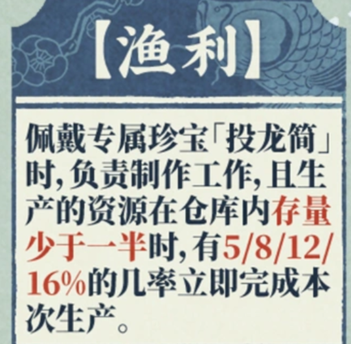 另一技能“渔利”,需在佩戴专属珍宝“投龙筒”的前提下触发。当其负责制作且对应资源库存不足一半时,本次生产有5%、8%、12%或16%概率实现即时完成,大幅提升资源周转效率与建造节奏。