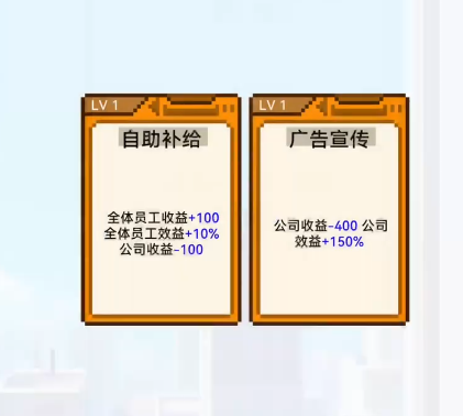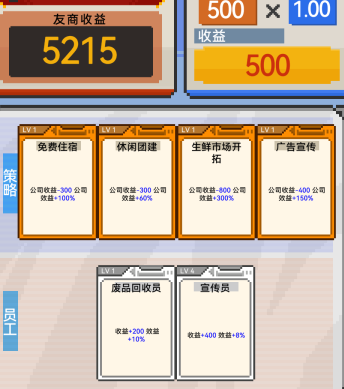 除角色天赋外,游戏内还设计了多类功能型卡牌,涵盖广告投放、自助补给、风险对冲等现实商业场景。多数卡牌具备双向效果——既带来阶段性增益,也可能伴随隐性成本或使用限制。如何权衡利弊、择机部署,构成 gameplay 的核心挑战。