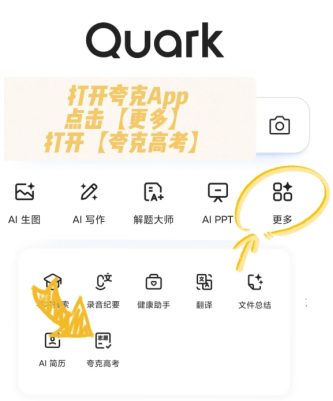 第一步:打开夸克APP,点击"更多"选项,选择夸克高考功能模块。