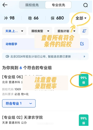 第五步:系统会显示符合条件的院校列表,顶部可选择院校优先或专业优先模式,注意查看右侧的录取难度标识。