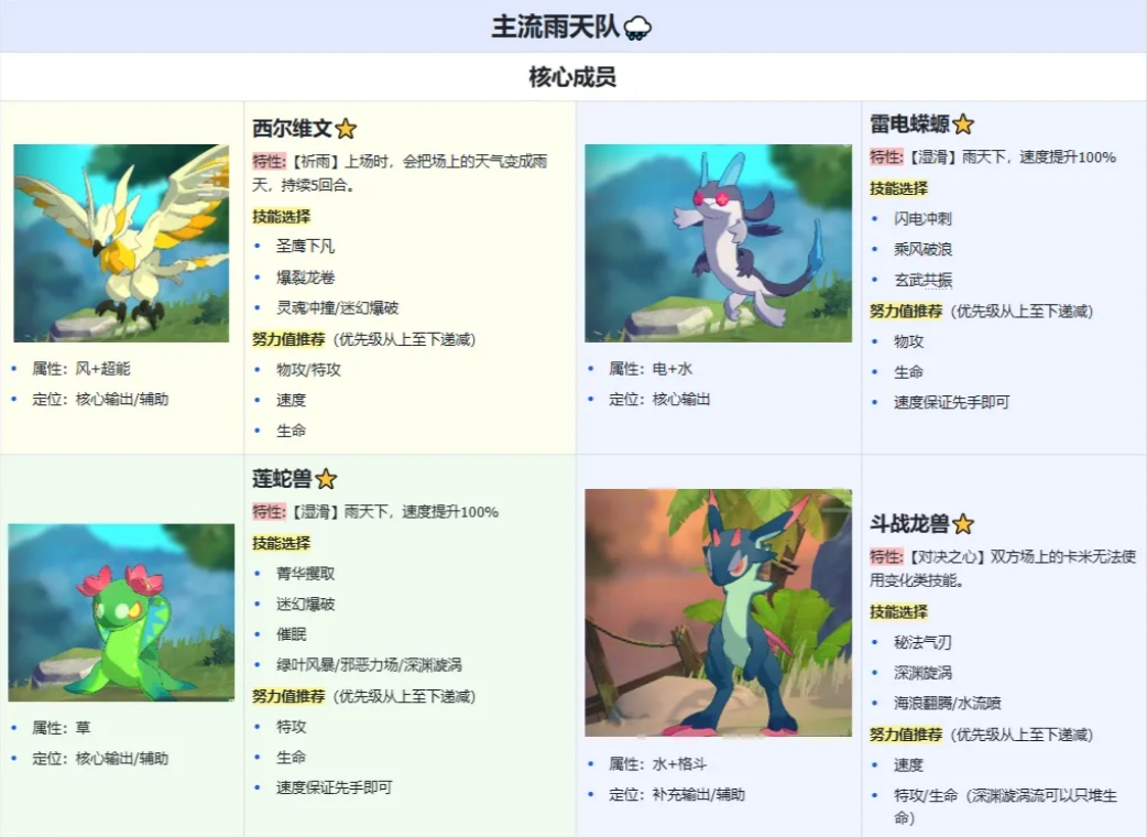 卡米的旅途游戏里雨天队是以雨天场地为核心的队伍,主要围绕西尔维文开局开雨天,搭配水系及电系高速输出与功能辅助成员进行战斗,以下是雨天队的搭配玩法详解。