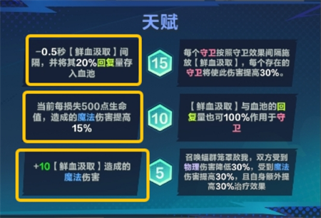 造成5倍被动的魔法伤害,持续3秒。期间生命值若低于30%,则立即消耗30%血池回复自身,每次大招仅生效1次,无法叠加。