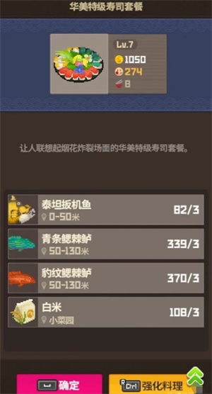由于稻田除了施肥以外,不需要任何其他成本,推荐大家直接优先拉满,产出的大米全部用于华美特级寿司套餐的升级,6-7级即可,没必要拉满,后面几级的所需材料数量完全够我们推主线任务解锁更高利润的菜谱