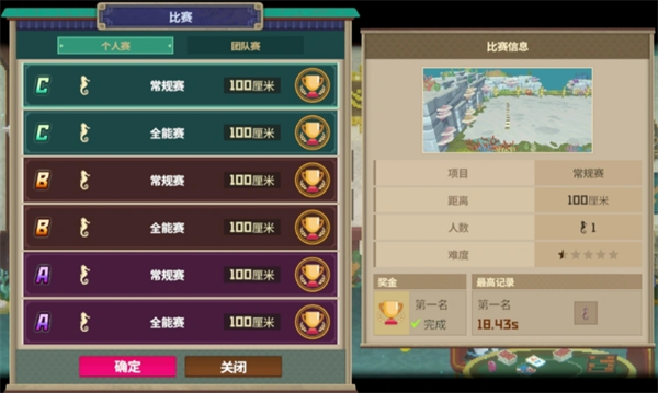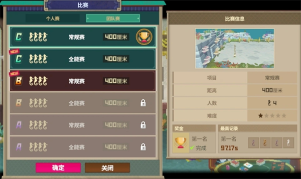 分为个人赛和团队赛,其中常规赛为单纯比拼速度,全能赛为设置障碍物的同时要求速度