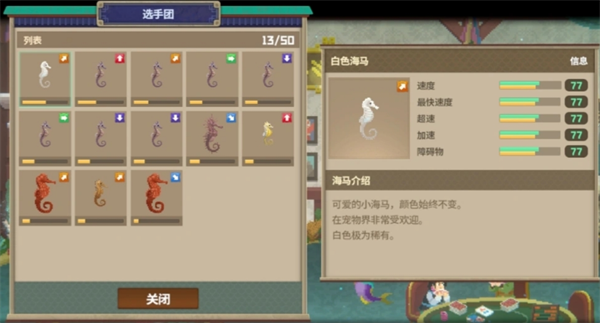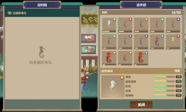 每次下海捕捉的海马选择放入装载箱可以到这里加入选手团,不要的海马也可以在管理中释放