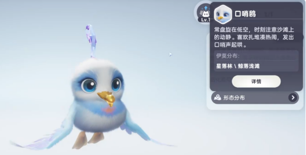 野外捕获口哨鸥有三处高概率点位:鸥鸣湾沿岸水域常见低至中等级个体,适合新手初期捕捉;新叶台地亦有稳定刷新,但同期存在星乐蒂与小炭犬,建议角色等级达36级后再前往;星落林海滩偶现异色个体,呈现蓝白配色,技能视觉表现更佳,但出现概率显著低于常规形态。