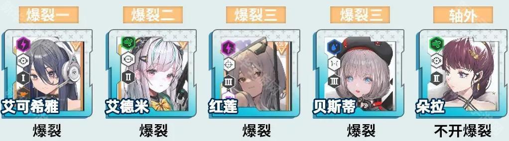 思路:辅助增伤及帮助输出位进入爆裂打伤害。建议两个辅助位选择20秒CD的角色,输出位则可以选择40秒CD的角色,确保每个20秒循环都有输出角色可以使用爆裂。