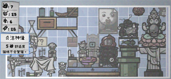这里很建议塞个贞洁神像,P商店送老猫解锁。因为这里的猫咪通常不会进行繁育,近亲繁育都会导致一些正面突变给顶掉,而且乱繁育很难控制变量,在这里的猫咪在每次过天数的时候概率会发生基因突变,几乎只有正面效果,不需要担心,尽可能叠变异值。