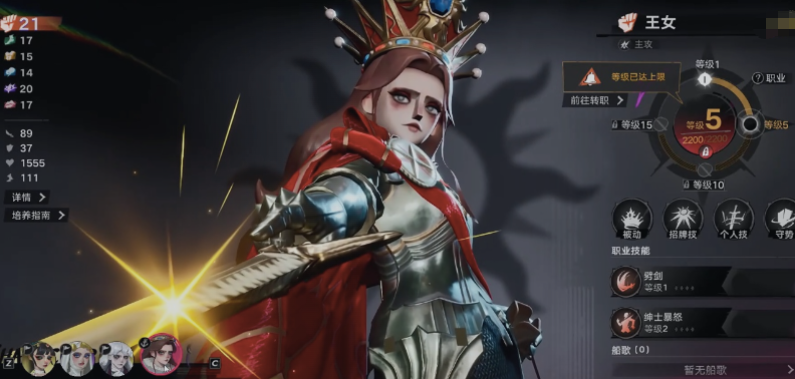 王女定位为近战爆发型主攻手,视觉标识为标志性皇冠。其战斗体系依托“战意”状态运转:一技能可瞬发140%攻击力伤害并快速积攒战意;二技能“猛斩”消耗20%当前生命值,对单体造成180%攻击力伤害,并额外获得一层战意;大招则需战意≥50方可激活,基础伤害为120%,且战意数值越高,最终伤害增幅越显著。配合单手剑装备,可高效清除低防单位,在精英战与Boss战中表现突出。