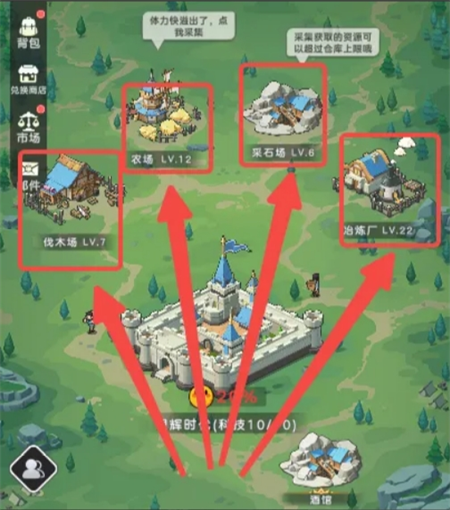 3、前期在蛮荒时代、石器时代、农耕时代,可以通过采集快速获得粮食、木材、石头,快速升级建筑