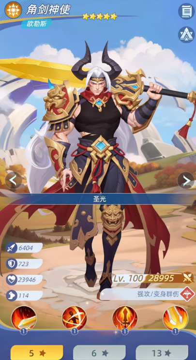 核心主C推荐角剑神使——其主动技“破军”可对全体敌人造成100%物理伤害,且伤害值的5%转化为自身生命;该效果随角色成长提升至140%伤害,并同步将45%伤害值转为生命回复,同时削减目标25%怒气。此机制不仅强化持续作战能力,更具备显著的怒气压制作用。被动技“天神下凡”在生命低于50%时触发:清除全部控制与负面状态,恢复20%生命,并进入“持铭剑神”状态,期间提供全队圣光系单位“圣光号令”增益,同时自身常驻20%伤害减免,极大提升团队容错率与续航稳定性。