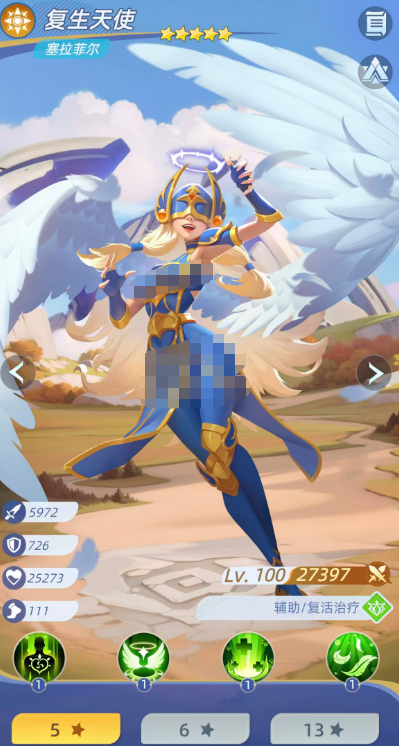 关键辅助位首选复生天使。作为圣光体系内稀缺的群体复活+高额治疗双修角色,其基础复活生命加成达308%,后期可提升至441%,并额外赋予被复活单位伤害减免效果。此外,她每回合结束时可为己方生命比例最低的3名单位恢复等同于自身攻击力68%的生命值;当目标生命比例处于全队最低时,还能清除其身上最多3个减益状态。该多重净化+定向续航能力,使其成为圣光队持续作战的核心支点。