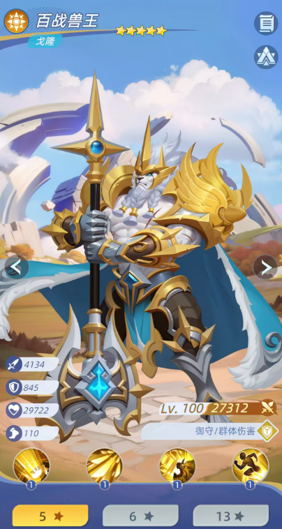 前排坦控一体角色选用百战兽王戈隆。其普通攻击在释放前自动提升20%暴击率,并转化为对敌方全体40%物理伤害,附带40%概率减速效果;技能命中后有50%概率降低目标伤害。更关键的是其被动复活机制:当受到致命伤害时,以当前生命上限20%的血量原地复活,并获得15%攻击力提升,确保前排站场时间与反打节奏。