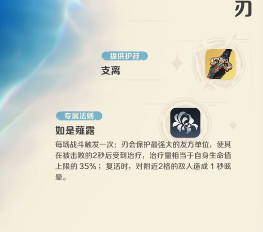 刃的核心机制为其专属法则【如是薤露】:每场战斗仅触发一次,自动锁定我方进阶等级最高的精灵,在其被击败后2秒内恢复相当于刃自身生命上限35%的生命值;复活生效时,对周围2格范围内所有敌人施加1秒眩晕效果。该机制不依赖手动释放,全程自动判定,且目标唯一指向“最高阶精灵”,无论其处于前排承伤位或后排输出位,均可获得等效“复活+控场”双重保障。此设计大幅降低关键单位暴毙风险,并在团战节奏中创造宝贵反打窗口,综合功能性与战略价值均属当前版本顶尖梯队。