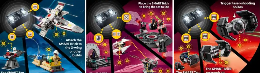 这次即将发售的八款星球大战套装,都加入了乐高新的 SMART Play 互动功能。简单来说,这些套装里的特殊积木块能发光、发声,甚至会有震动反馈。而新上线的 SMART Assist 应用,就是用来管理和增强这些体验的。