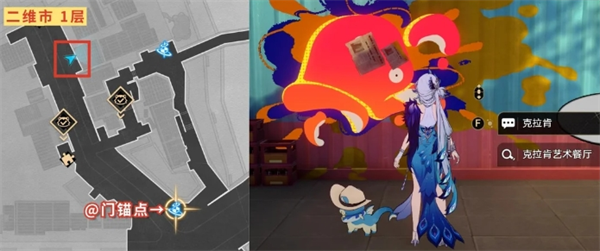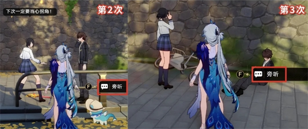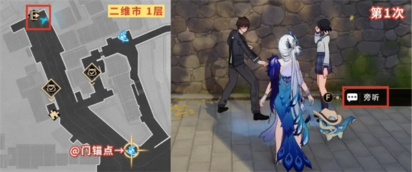 到二维市1层-@门锚点附近这,旁听这两个人的对话。听完左转传去绘世学院,之后再回头返回二维市,重复这样的操作,一共旁听3次对话即达成【转角遇到爱】成就