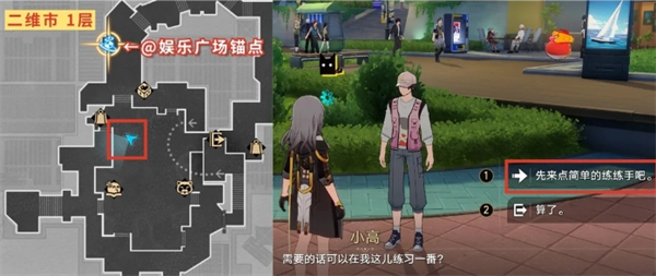 到二维市1层-@娱乐广场锚点附近这,跟【小高】对话,选择【先来点简单的练练手吧】