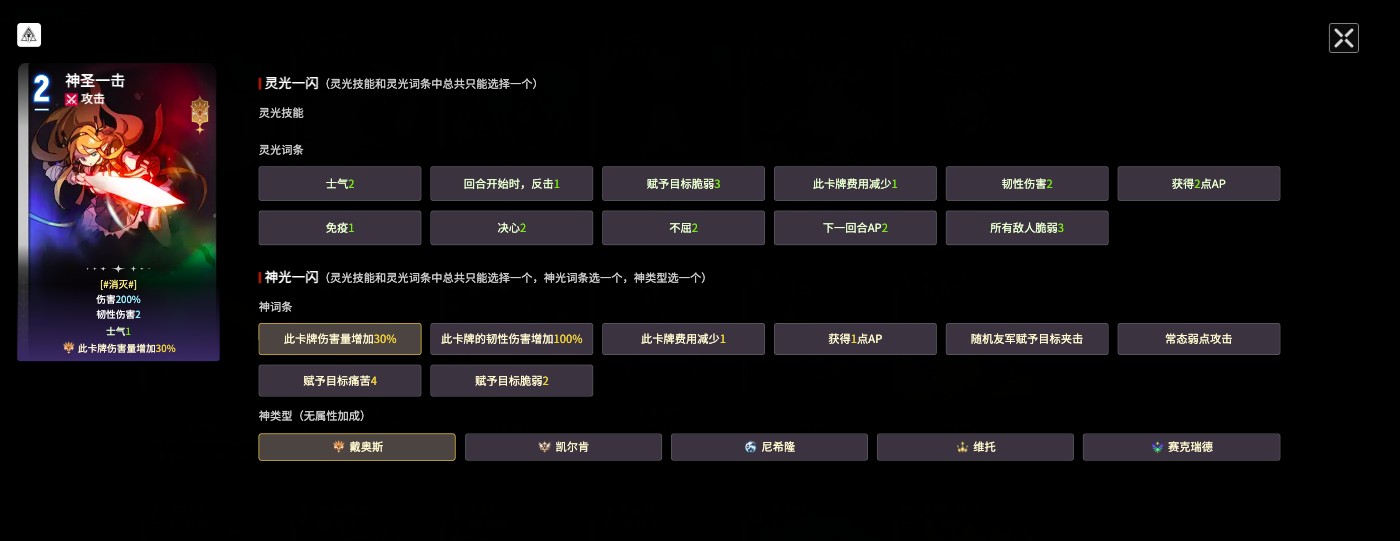 第二张卡牌”神圣一击“,在启动”消灭“状态后,此卡牌的伤害可以达到200%,达成的流血量十分可观,建议使用的神词条包括”卡牌的韧性增加100%“、”此卡费用减少1“、”赋予目标痛苦4“,这四个词条可以减少相关费用,而且在流血量上也起到了较强的辅助作用。