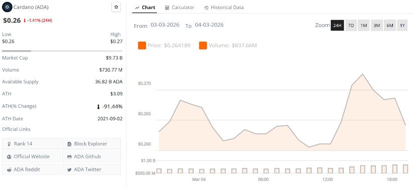 卡尔达诺价格正围绕0.26美元关键支撑区交易,在近期抛压后试图企稳。该区域正成为重要的短期枢轴点——若坚守其上,ADA或迎来盘整;若失守则可能下探更低需求位。