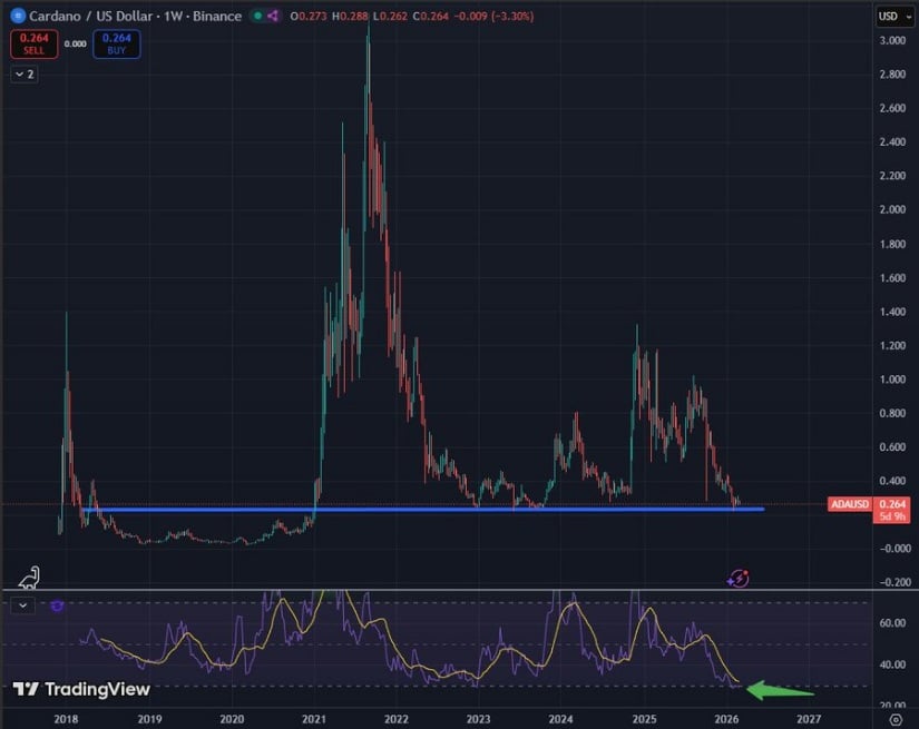 市场评论员Sssebi指出,ADA较高周期指标正接近历史超卖水平。该价位区间曾多次吸引长线买家入场。