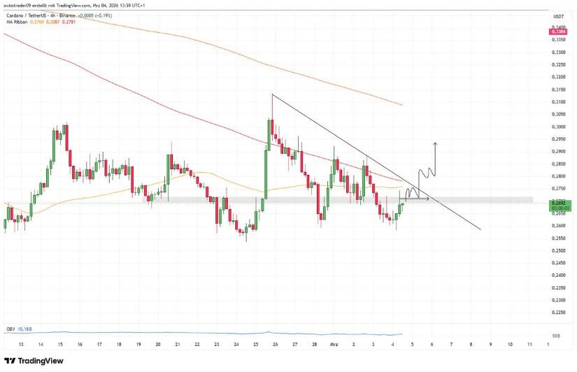 ADA受下降趋势线压制,突破或开启0.29-0.30美元上行空间。数据来源:swisstrader09/X