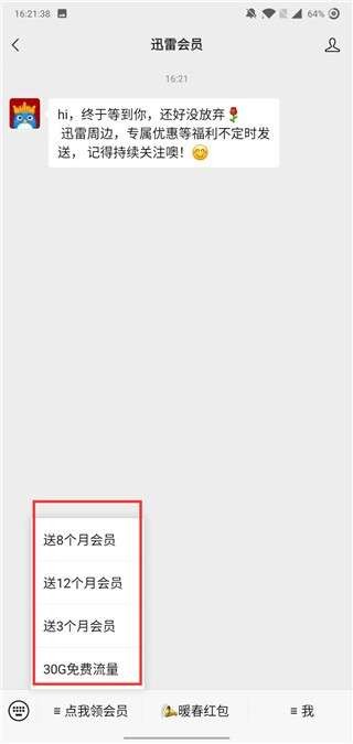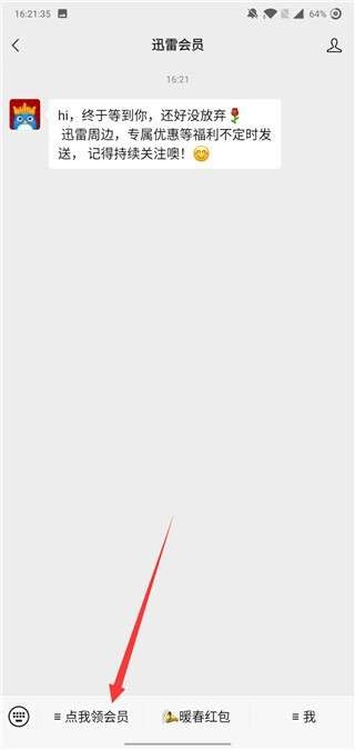 第二步:成功关注公众号后,系统将自动推送欢迎信息,点击底部菜单栏的"点我领会员"按钮。