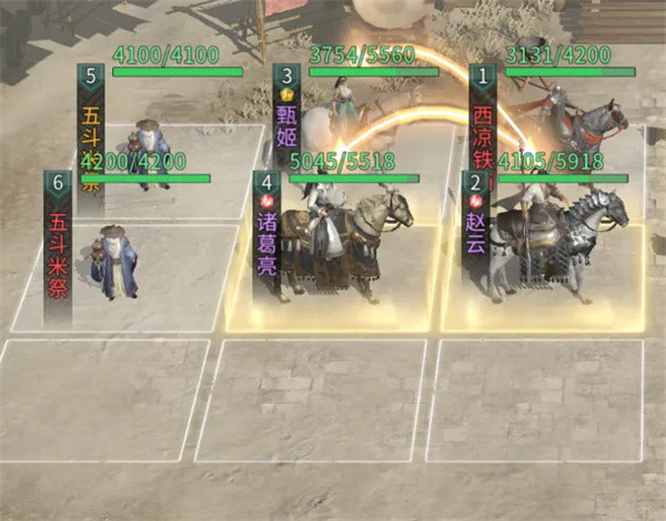 兵种站位:赵云的上方放置一名西凉铁骑;在甄姬与诸葛亮的后方,分别放置一名五斗米祭。