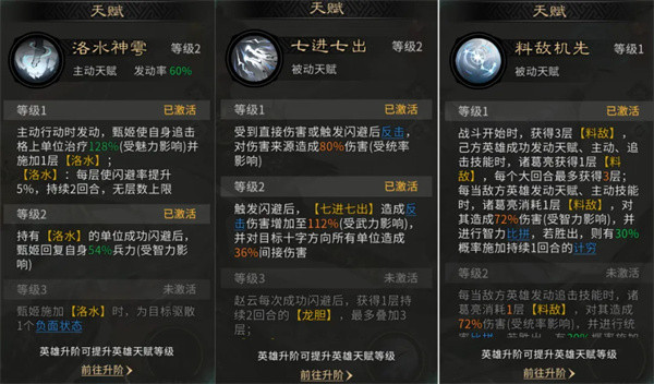 诸葛亮天赋【料敌先机】在敌方英雄发动天赋或主动技能时,可对其造成伤害并进行智力比拼,若胜出则有30%概率施加持续1回合的计穷;在敌方发动追击技能时,则进行统率比拼,胜出后同样有30%概率施加持续1回合的牵制。该天赋能有效干扰敌方的技能循环,兼具输出与控制效果。