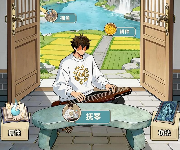 琴房为特色静修空间,抚琴可提升功法领悟效率;琴房毗邻池塘与农田,支持垂钓、耕种等轻度交互行为,产出资源直接用于功法研习。功法体系按白、绿、蓝、紫、橙五档稀有度划分,集齐指定组合功法密卷后可触发“化劲”机制,大幅提升基础属性上限,并激活专属战斗特效。此外,擂台系统提供实时PVP切磋环境,验证修炼成果。