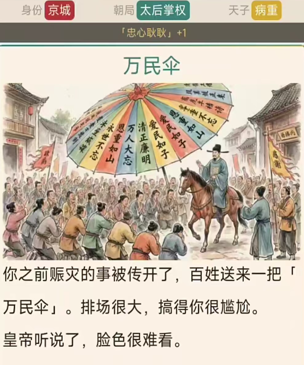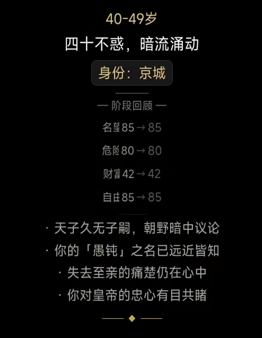 游戏内置数十种差异化结局,覆盖明君治世、昏聩亡国、急流勇退、隐逸山林等多种历史向可能性。不同路线间存在强逻辑闭环与隐藏条件,部分结局需满足特定属性阈值(如民心≥85、威望≥70、后宫好感总和≥120)方可触发。这种高重玩性设计,使得反复探索成为核心乐趣之一。