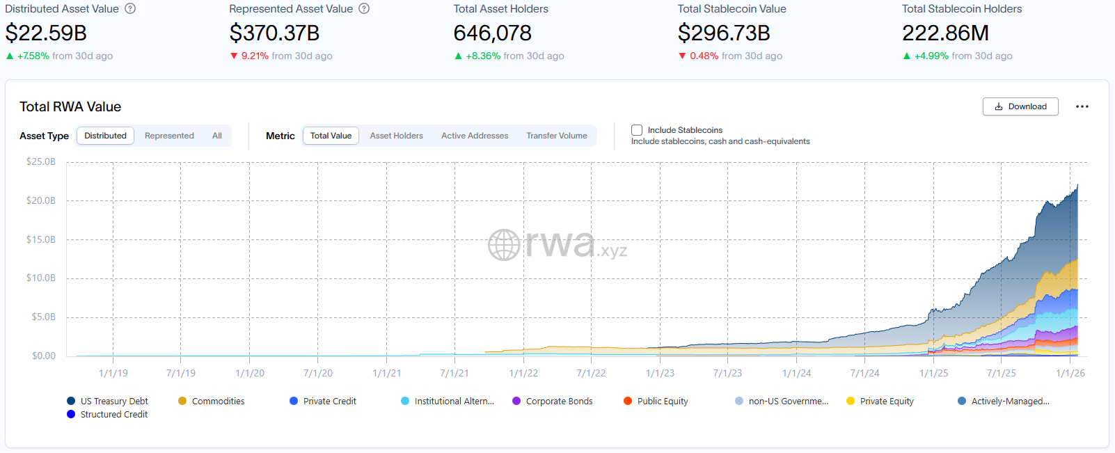RWA.xyz 最新数据披露,截至2026年1月23日,RWA 链上总市值达225.9亿美元,环比上月同期增加7.58%,增长稳健;资产持有者总数增至约64.61万,环比上月同期上涨8.36%。
