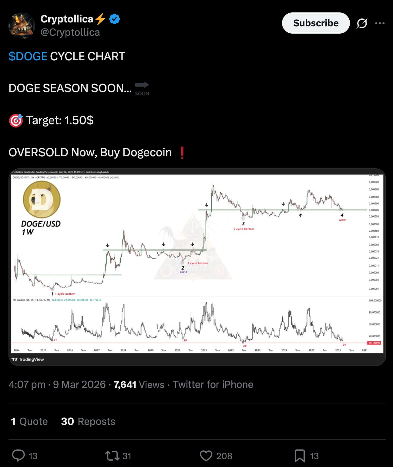 分析师Cryptollica发布的DOGE周期图表(基于DOGE/DXY交易对)显示超卖信号,预示"狗狗币季节"即将来临,并给出1.50美元的目标价位。