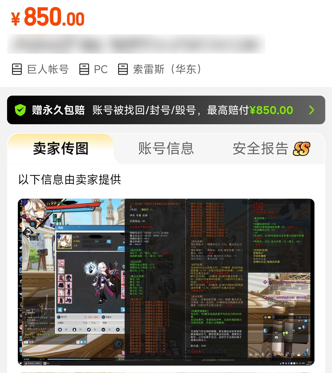 在上给游戏的成品号都附赠了【永久包赔】服务,这项服务进一步增加了大家的购买意向。很多玩家都担心自己买完号之后,账号又被找回去了,有了这个服务就能让大家大胆下单了。在账号页面上可以看到通过这项服务具体可以赔付多少,基本上能覆盖买号时的费用。