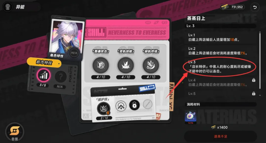 推荐自动流阵容:白藏(必选)、娜娜莉、薄荷、法蒂娅;若追求更高容错率,可选用阿德勒、翳、小吱作为手动辅助备选。自动化实现的关键前提在于——白藏达到3级都市技能,该技能赋予核心特性:“即使顾客耐心耗尽或被锤子击中,连击状态仍可持续计算”。这意味着,玩家只需持续点击左侧锤子按钮,即可稳定维持连击不断档,完全规避上菜时机判断失误带来的中断风险。
