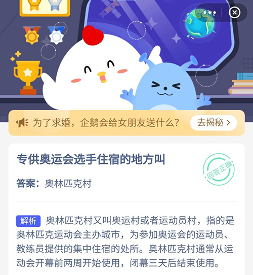 以上就是关于专供奥运会选手住宿的地方叫什么?这个问题的正确答案,获取正确答案的小伙伴们,赶紧去领取属于自己的小鸡饲料吧,明天也会持续为你更新哦。