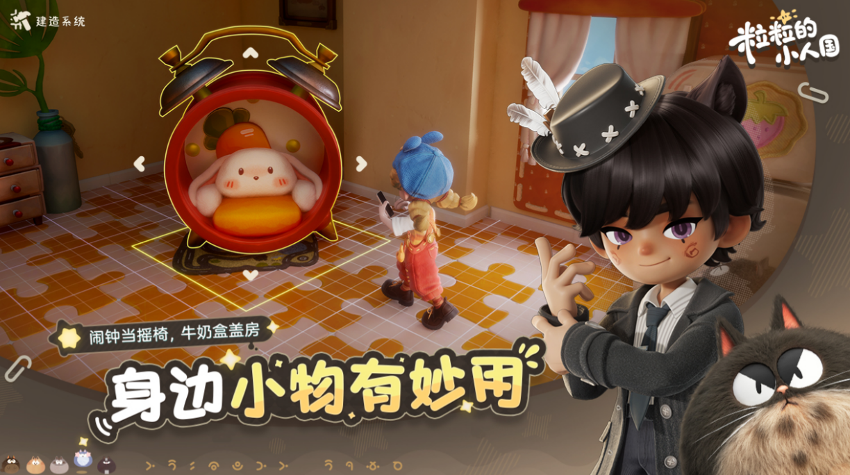 《粒粒的小人国》是由阿里巴巴旗下灵犀互娱研发的原创移动游戏。在游戏中,玩家将化身微型居民,在由真实生活物品重构而成的微观世界中展开日常——茶杯可改造为休憩咖啡角,戒指盒能变身舒适沙发,火柴与纽扣组合成别致座椅。整体节奏松弛自然,强调自由探索与情感陪伴,无强制任务压力,也无需重复刷本推进进度。