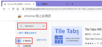3、.在页面左上角点击搜索框勾选“扩展程序”,在输入框中输入“Tab Menu”字样。