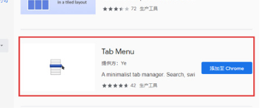 4、在搜索页面结果中找到“Tab Menu”扩展程序,点击后面“添加至Chrome”按钮进入下一页面。