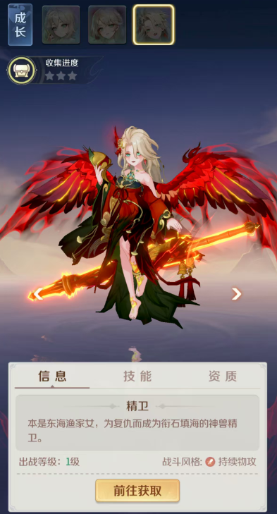 「精卫」以持续伤害与战术协同见长。普攻对前三名敌人造成87%物理伤害,并附加持续2回合的中毒诅咒;群攻时触发“毒爆”效果,实现两段式输出。其被动“血祸”可随攻击次数叠加层数,提升自身爆发阈值;同时,当队友行动后,精卫将获得额外普攻伤害加成,形成稳定的协同输出链,在持久战与多波次作战中优势显著。