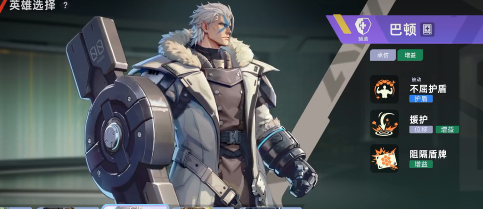 其技能设计高度围绕盾牌展开:被动【不屈护盾】可在角色被破甲时即时生成1500点护盾值——该数值显著高于一件完整紫色品质护甲所提供的900点护盾加成,凸显其被动机制的战略价值;一技能【援护】兼具位移、群体击退与团队减伤三重效果,开启后为自身及周围友方单位提供持续3秒、幅度达30%的伤害减免;终极技能【阻隔盾牌】则拥有完全格挡飞行类子弹的特殊判定,使其在火力压制、掩体推进与反制远程集火等场景中具备不可替代性。